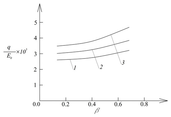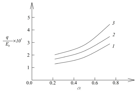 Diagrams of the dependence of normalized pressure on the parameter (1—for , 2—for , and 3—for ).