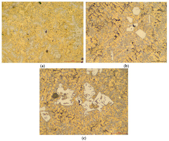Following the treatment of the AlSi18Cu5Mg alloy at a beryllium concentration of 0.01%, a negligible number of primary silicon crystals appear to have been modified, the majority of them being coarse, irregularly shaped and of a large size. (Figure 1c). The conditional mean diameter was measured and calculated to be in the range of 95–110 μm. The most likely reason for the structure thus obtained is the overmodification of the alloy, which typically arises due to an increase in the amount of the respective modifier. The primary silicon crystals in the structure of overmodified alloys are larger in size than the ones in unmodified alloys. The modification coefficient of the beryllium modifier at a concentration of 0.01% was calculated to be K = 38%. The eutectic silicon crystals have dimensions in the range of 10–30 μm, as in all experiments that were carried out. The α-phase microhardness is 80.6 μHV50/10.