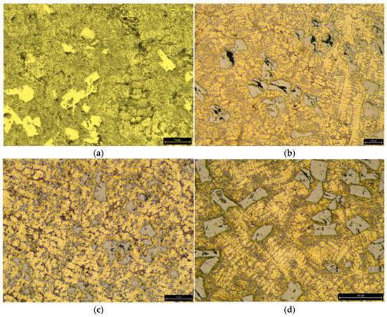 Microstructure of AlSi18Cu5Mg alloy modified with Be, Ti, B and P: (a) modified with Be concentration of 0.007 wt%, 0.015 wt% Ti, 0.003 wt% B and 0.04 wt% P and subjected to T6 heat treatment with artificial ageing parameters of 330 °C/8 h; (b) modified with Be concentration of 0.005 wt%, 0.015 wt% Ti, 0.003 wt% B and 0.04 wt% P and subjected to T6 heat treatment with artificial ageing parameters of 330 °C/8 h; (c) modified with Be concentration of 0.007 wt%, 0.015 wt% Ti, 0.003 wt% B and 0.04 wt% P and subjected to T6 heat treatment with artificial ageing parameters of 210 °C/16 h; (d) modified with Be concentration of 0.005 wt%, 0.015 wt% Ti, 0.003 wt% B and 0.04 wt% P and subjected to T6 heat treatment with artificial ageing parameters of 210 °C/16 h.