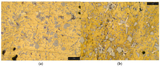 A metallographic analysis of the AlSi18Cu3CrMn alloy modified only with phosphorus and subjected to T6 heat treatment with artificial ageing parameters of 210 °C/16 h and 330°/8h was also conducted. The microstructure of the AlSi18Cu3CrMn alloy subjected to quenching and artificial ageing at a temperature of 210 °C and a holding time of 16 h is shown in Figure 4a. The results of the microstructural analysis reveal that the majority of primary silicon crystals are polygon-like with straight walls, with their dimensions varying in the range of 27–40 μm. The majority of the eutectic silicon crystals are elongated and ‘needle-shaped’, but a certain number of them became rounded, with their dimensions being in the range of 7–26 μm. The α-phase macrohardness of the alloy thus treated is 140 μHV50/10. In the alloy heat-treated by quenching and artificial ageing at a temperature of 330 °C and a holding time of 8 h, the primary silicon crystals are regularly shaped, with their dimensions being in the range of 24–28 μm. Eutectic silicon, whose dimensions are in the range of 15–18 μm, appears to be needle-like in the plane of the microsection, with numerous small crystals having adhered to each other. The α-phase microhardness of the alloy thus treated is 112 μHV50/10.