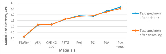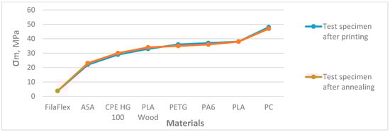 The Tevo Tornado (produced by company TEVO 3D Electronic Technology Co., Ltd., in Zhanjiang, China) and Ultimaker S5 (manufactured by Ultimaker, Zaltbommel, Netherlands) printers were used, depending on the 3D printing filament. The printing settings were set with the Cura program. Six test specimens were produced from each of the materials, namely PLA, PLA Wood, PETG, PC, PA6, ASA, CPE HG100 and FilaFlex SEBS, (manufactured by 3D Jake, Paldau, Austria) according to the settings described in [23]. For two of the materials—PC and PA6—heating was performed at a temperature of 90 °C for 2 h, recommended by the filament manufacturer. This was done in order to achieve the best mechanical performance of the printed object. One more test body was made for these two materials, which was not heated, in order to test and determine how heating affects the mechanical characteristics. The test bodies were marked as “unannealed”. All test bodies were produced with 30% filling with a Geroid grid and 0.1 mm layer height.
