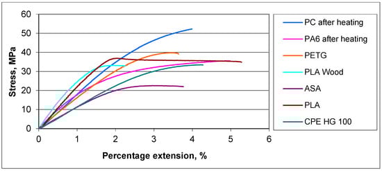 Stress (MPa)–percentage extension (%) diagrams with one deformation curve each were constructed for materials PC after heating, PA6 after heating, PTEG, PLA Wood, ASA, PLA and CPE HG 100, presented in Figure 6.