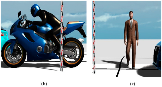 In the materials collected during the investigation, there is no data on the type, number, and coordinates of the vehicles, parked at the right edge of the roadway. In the modelling process vehicles of general dimensions and shape were selected, located at a distance of one metre from each other—Figure 1a,b shows the selected motorcycle-driver module according to the accepted input data. With a seat height of 0.80 m from the ground level, the selected driver position also covers higher speed driving options. Due to the lack of data on the exact position of the motorcyclist, the study was conducted in the configuration shown in Figure 1b. The height of the pedestrian corresponds to the input data—1.61 m, Figure 1c.