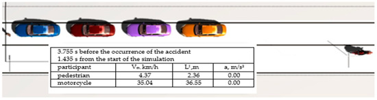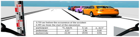 According to the data, immediately before the collision, the pedestrian changed his direction of movement, going back “one or two steps” a distance of about 0.8 m. The total distance travelled by the pedestrian from the moment he stepped onto the carriageway to the moment of impact is 5.7 m. It is defined as the sum of the distance from the right-hand kerb to the point of impact, 4.1 m, and a distance of 2 × 0.8 m = 1.60 m (according to witness testimony, the pedestrian initially moved away from the point of impact by about 0.8 m and then moved backwards). The analysis in examining this hypothesis is carried out, from the moment chosen above, 3.755 s before the accident occurred, at which the victim became clearly visible to the motorcycle driver. The results of the kinematic analysis are shown in Table 2.