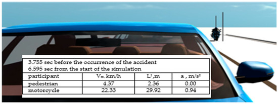When comparing the full braking distance, Sz−1 = 12.42 m, which was necessary for the driver to stop the motorcycle, from 3.755 s before the accident occurred, with the actual distance, at the same moment, from the front of the motorcycle to the point of impact L1 = 29.05 m, the conclusion is that in this situation the motorcycle driver had the technical ability to stop before the impact point, and thus prevent the traffic accident from occurring.