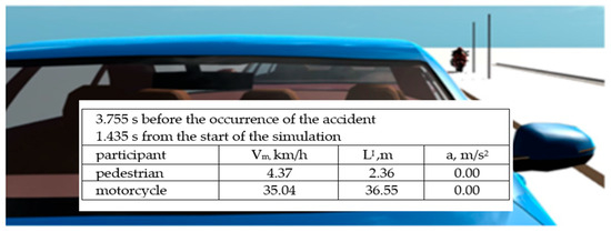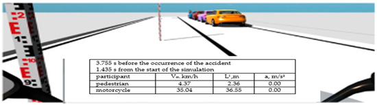 In an Analyzer Pro software environment, the motion of the two participants was simulated. The aim is to determine their relative positions at discrete moments and to estimate their visibility to each other. The pedestrian’s movement is divided into four main intervals, each of which is indicated by its duration—t, s; the speed reached at the end of the respective interval—VpI, km/h and the distance travelled within the interval—L, m. The motorcycle, from the moment of starting off upon entering the intersection until the impact occurs, accelerates, reaching a speed VmI, km/h and travels a distance L, for a period of time—t = L/VpI, s. The results from the conducted kinematic analysis are shown in Table 1.