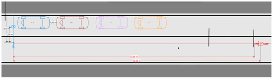 When comparing the required braking distance determined in the second hypothesis—Sz−1 = 20 m, in the event that the driver makes an extreme brake 3.755 s before the accident occurs, with the actual distance at the same time from the front of the motorcycle to the point of impact L2 = 35.68 m, the conclusion is reached that the motorcycle driver had the technical ability to stop before the point of impact and thus prevent the accident from occurring. The examination of the pedestrian’s visibility leads to the technical conclusion that 3.755 s before the accident occurs, the pedestrian had visibility of the approaching motorcycle (Figure 9).