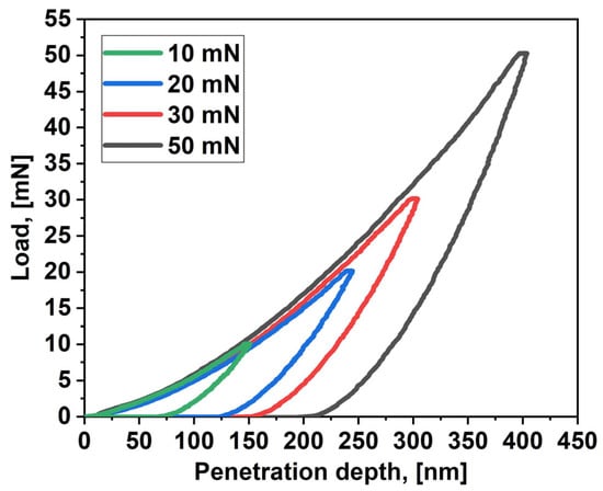 Figure 2. It is visible that the load (left) branches of the curves coincide for measurements with different loads (and performed at different locations on the sample), which is evidence of the homogeneity of the coating. Moreover, the curves are smooth, which proves that no cracks appeared in the indentation area [