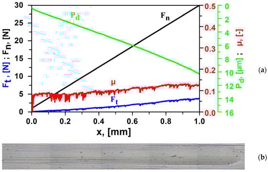 For the sample with the highest hardness, the adhesion and coefficient of friction were measured using the Micro Scratch Tester (MST) module of the same equipment (CSM Instruments, Anton Paar GmbH, Graz). A Rockwell diamond indenter with a tip rounding of 200 µm was attached. The scratches were set to a length of 1 mm and the load force was increased linearly from 0.5 to 30 N at a rate of 1 N/min.