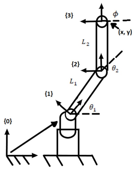 The forward kinematics of a robot is expressed in determining the position and orientation of the frame of its end-effector from the coordinates of the joints θ. Figure 2 illustrates the problem of forward kinematics of the robot under consideration. We have to solve a problem of a planar system with two degrees of freedom. The lengths of the links are and . We select a zero fixed frame {S} with a beginning localized on the base joint (equal to frame {0} in Figure 2) and set the frame of the end effector {B} (equal to frame {3} in Figure 2). The cartesian position (x, y) and orientation of the end-effector as a function of joint angles () are calculated as: