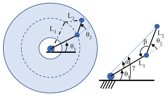 For a common open circuit with n number of degrees of freedom , the inverse kinematics problem is as follows: a homogeneous transformation is given , to find solutions , those who satisfy . We consider Equations (1) and (2) for a two-link robot and are only interested in the position of the end-effector (Figure 4). For our robot, where , the set of reachable points (i.e., the workspace) forms a ring with an inner radius of and an outer radius . Given the extreme position of the effector (x, y), it is not difficult to see that there will be either zero, one, or two solutions depending on whether (x, y) lies in the outer, boundary, or inner part of this ring, respectively. When there are two solutions, the angle of the second joint can be positive or negative. These two solutions are sometimes called “left” and “right” solutions or “elbow up” and “elbow down” solutions.