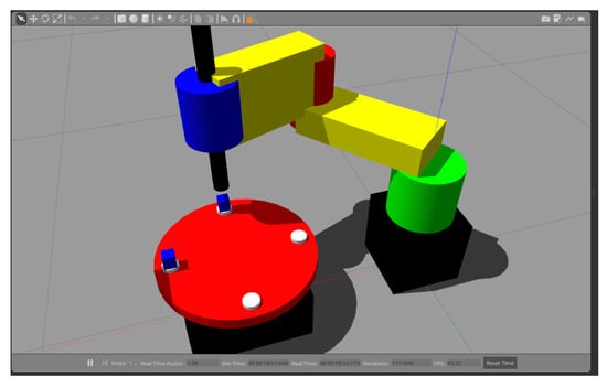 Between link 1 and link 2 is located joint 2. Here, link 2 rotates around the Z axis of the joint, which is also oriented upwards. The third joint is prismatic and lies between link 2 and the axis of the end effector. The developed simulation model in the Gazebo simulator is presented in Figure 5.