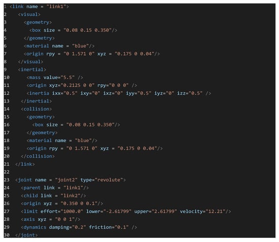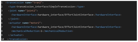 The description of the joints includes the setting of parental and child links, position and orientation of the connection between them, type of drive, dynamic characteristics, and speeds and limits of movement. All these parameters are presented in rows 23 to 30. Here, attention should be paid to the speed parameter, which is taken from Table 1. Once the overall structure of the robot is formed, simulated actuators must be added to represent the real motors. In the code below (Figure 7), an example of controller and actuator definition at joint 2 is presented. In this way, a simulation of a hardware device that can be controlled as an electric motor is created.