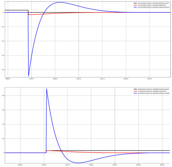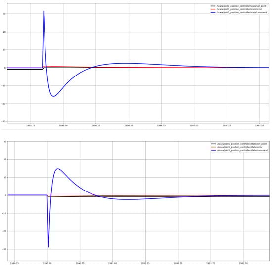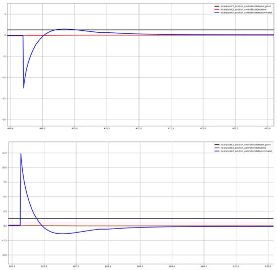 The purpose of tuning the controllers is to achieve the same movement of the simulated robot and the real one as accurately as possible. For this purpose, each of the joints is adjusted correctly. The presented graphs visualize the results of the settings and behavior of each of the robot joints when rotating in both directions; they also show the control of the rotary table are shown in Figure 8, Figure 9 and Figure 10 respectively. The joint control results presented are for joints 1 and 2 and for the rotary table. On all graphics, the same color legends are used as follows: in blue is the value of the control signal, in black is the set position and in red is the moment error.