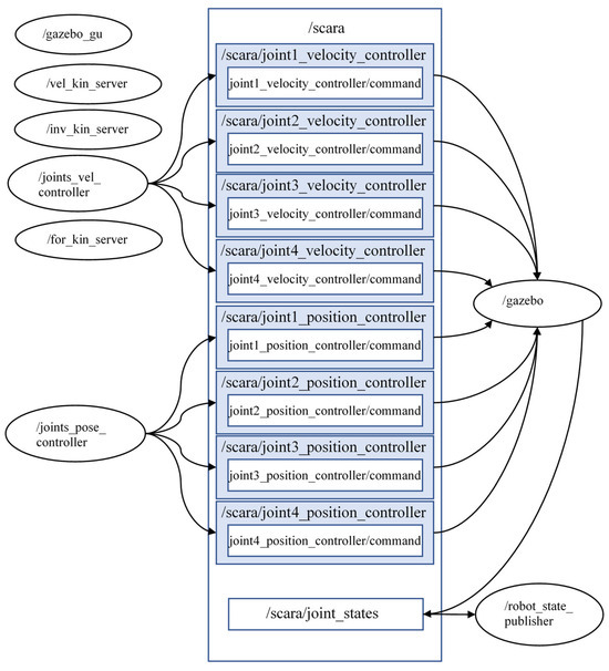 The derived mathematical equations for the line, inverse and velocity kinematics are described in separate programs and can be called as necessary. They operate in the form of services. They also introduce positioning restrictions, and check for a valid desired position. The control of the simulated robot is also carried out by using a service. This service obtains as input arguments the position of the end effector in Cartesian coordinates as well as its displacement up and down the Z-axis. The service call form is “x: 0.0 y: 0.0 z: 0.0”, each parameter representing a floating-point number. The developed service invokes joint_pose_controller and joint_vel_controller nodes until the desired position is reached.