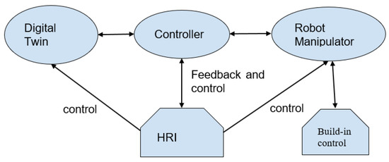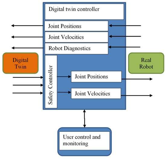 The system implements the control of both the real robot and the digital twin in real time. In addition, different interfaces and tools for human–robot interaction can be developed. Given the specificity and needs of the digital twin method, the scheme in Figure 12 is presented. It shows the general structure and manner of transmission of data between the individual participants.