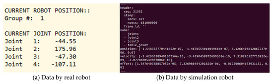 In the center of the system stands the main controller. Its task is to make the connection between the real robot and the simulated robot in real time. It connects to the real robot by using a standard Modbus protocol. On the other side, it connects to the digital twin via web sockets. In the controller itself, a comparison of the current positions of each of the robot joints as well as of the current speeds occurs. As standard in industrial robots, the speed is set as a percentage. Therefore, the set speed here is measured in percentages. The initial form of the data for joint positions are presented in Figure 13a,b. Entering the controller, the data from the digital twin is rounded to the second character after the comma and compared with that of the real robot. In addition, to find out in which of the systems there has been a change, we use time data. We compare which action occurred first, then commands are sent to move the system where no action is registered.