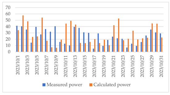 Figure 3 presents a daily comparison of measured and simulated electrical power output for October 2023. The chart shows the recorded power values and the corresponding PV*Sol Expert simulation results for each day of the month.
