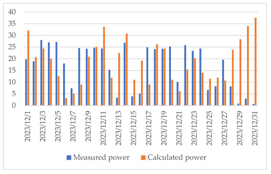Figure 7 presents a daily comparison of measured and simulated electrical power output for December 2023. The chart shows the measured power values (blue) and the simulated values (orange) for each day of the month.