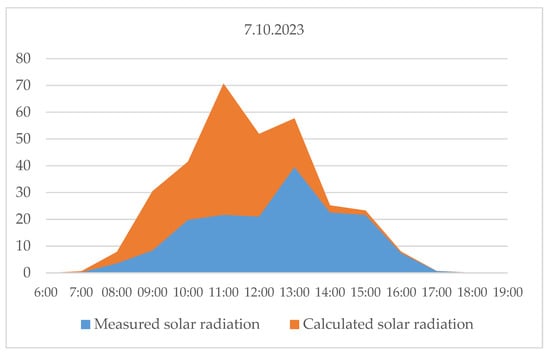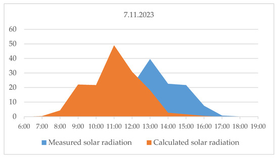 Figure 12 presents an hourly comparison of measured and simulated solar irradiance for 7 November 2023. The chart shows the measured irradiance values and the corresponding simulation results for each hour of the day.