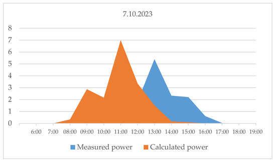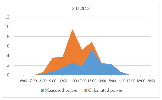 Figure 11 presents an hourly comparison of measured and simulated electrical power for 7 November 2023. The chart shows the recorded power values along with the corresponding PV*Sol Expert simulation results throughout the day.
