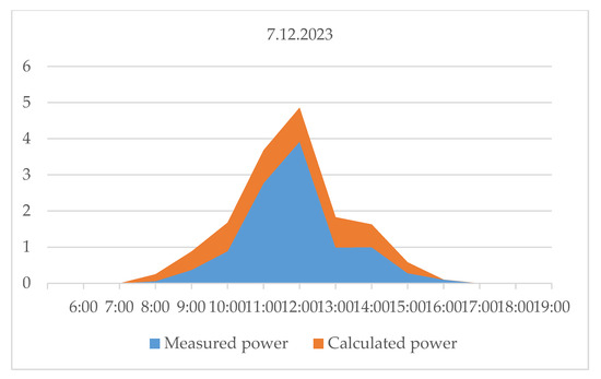 Figure 13 presents an hourly comparison of measured and simulated electrical power for 7 December 2023. The chart shows the recorded power values along with the PV*Sol Expert simulation results for each hour.