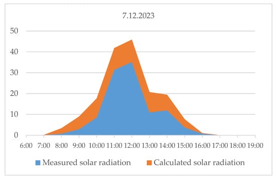 Figure 14 presents an hourly comparison of measured and simulated solar irradiance for 7 December 2023. The chart shows the measured and simulated irradiance values throughout the day.