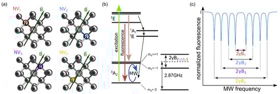 - Schloss, J.M.; Barry, J.F.; Turner, M.J.; Walsworth, R.L. Simultaneous Broadband Vector Magnetometry Using Solid-State Spins. Phys. Rev. Appl. 2018, 10, 034044. [Google Scholar] [CrossRef]