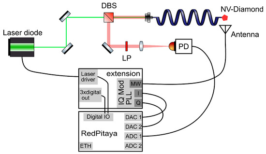 The optical setup is shown in Figure 2. We used an excitation laser PLT5 520B (Osram, Premstaetten, Austria) with a power of 70 mW at a driving current of 170 mA, measured at the input of a multimode fiber (MF) FG105UCA (Thorlabs, Newton, NJ, USA). As shown in Figure 2, the laser beam is adjusted by two mirrors and passes a dichroic beam splitter (DBS) DMSP567 (Thorlabs, Newton, NJ, USA) to a collimator lens F950FC-A (Thorlabs, Newton, NJ, USA). The collimated light is then fed into a MF and guided to the NV diamond MDNV150umHi30mg (Adamas, Raleigh, NC, USA), which is glued to the MF with optical adhesive NOA61 (Norland, Jamesburg, NJ, USA). The fluorescence of the diamond is then guided through the MF back to the collimator and reflected by the DBS to a longpass filter FELH0600 (Thorlabs, Newton, NJ, USA), which blocks unwanted excitation light. Finally, a collimation lens LA1951-AB (Thorlabs, Newton, NJ, USA) focuses the filtered fluorescence onto the photodiode (PD) S5971 (Hamamatsu, Shizuoka, Japan). The photocurrent is amplified by with a transimpedance amplifier, followed by an amplifier with a gain of 19. The antenna for spin driving from [3] is used.