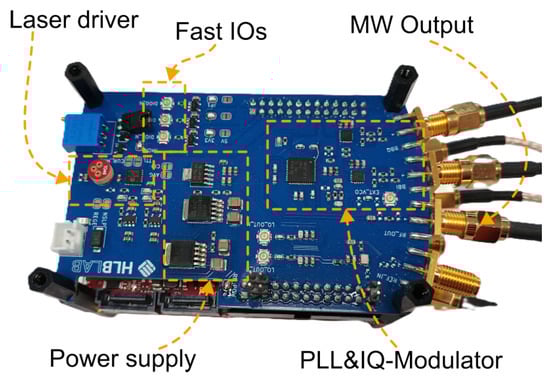 Top view of the add-on board. The board contains a laser driver for 30 mA to 200 mA, which can be controlled via the FPGA. A power supply for the laser driver, the PLL, IQ modulator, and the Red Pitaya. On the right side is the circuit for the PLL and the IQ modulation. The inputs of the IQ modulator have a level adjustment for the Red Pitaya.