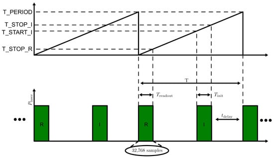 The generation of laser pulses is shown in Figure 5 and is managed by a counter that starts at zero and increases to a specified adjustable value T_PERIOD. This counter is 32 bits wide and is driven by the internal 125 MHz clock. Actions are triggered based on specific comparisons within the counter. When the counter is at a value of 0, it initiates the readout pulse, activating the laser and producing an output trigger for ADC sampling. Once the counter reaches the value of T_STOP_R, the laser is switched off and remains off until the counter reaches T_START_I. The laser is then switched on for the initialization, where the sampling is not required until T_STOP_I.