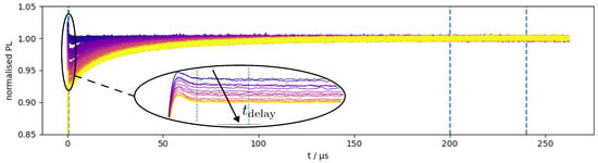 Sampled, normalized, and averaged photoluminescence signals at different delay times are shown. As the delay increased, the signal had less energy. An average from to was used for further evaluation of the T1 time. The detailed section shows the leading area of the measurement data. The vertical lines define the evaluation range for the mean value.