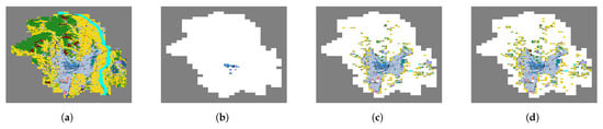 Visualization of Land Use (LU) distribution for (a) Utsunomiya City and the corresponding sets: (b) U (15 meshes), (c) V (513 meshes), and (d) W (613 meshes). Each LU category is represented by a distinct color.