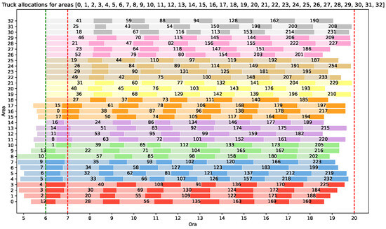 Figure 1 shows a sample output produced at the end of the pipeline of processes in the case of the dock door allocation. The case study is based on a large warehouse consisting of several internal areas. Time series of handling unit flows among the areas, specifically directed to the outbound staging areas, were available. The outbound flows were bootstrapped, as described in Section 2.1. After generating the bootstrapped time series, we applied bagging to combine the outputs of multiple models trained on different bootstrap samples, thus obtaining the desired forecasts.