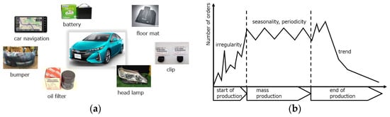 Service parts are essential for customers who wish to use their vehicles for a long time. Therefore, it is necessary to prepare for customer demand not only during vehicle production but also afterward, as maintenance may last over ten years after the product launch. Consequently, long-term changes in demand characteristics must be considered in the demand forecasting of service parts. The demand for these parts varies over their life cycle, with different characteristics in the early, middle, and late stages (see Figure 1b). Additionally, from a short-term perspective, the demand for service parts exhibits periodic fluctuations, such as seasonal changes, along with long-term variations. Therefore, to accurately predict the demand for a specific part, it is necessary to consider its historical order data.