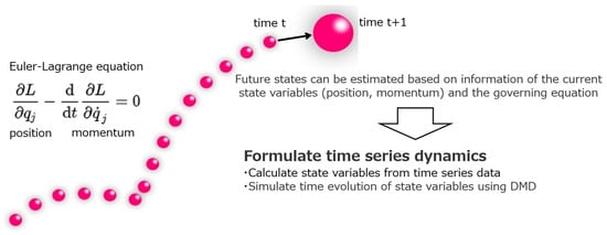 To accurately forecast various demand patterns of service parts that change complexly over time, the forecasting model should ensure accuracy not only within the range of available historical order data (interpolation range) but also in the range where no training data exists (extrapolation range). Existing forecasting methods utilizing common statistical and machine learning techniques often face the challenge of ‘extrapolation’ [12]. In this section, a forecasting method is proposed to deal with the difficult task of ‘extrapolative forecasting’, drawing inspiration from dynamical systems. As shown in Figure 2, in a dynamical system, the future states of the rolling motion of a ball can be determined by using information about its previous position and momentum under a governing equation, such as the Euler–Lagrange equation [13]. In time series data, if we can define the information of state variables corresponding to position and momentum at each time point from the time series data and can also simulate the laws of transition for such state variables at each time point, it will become possible to estimate the future states in a manner similar to dynamical systems.