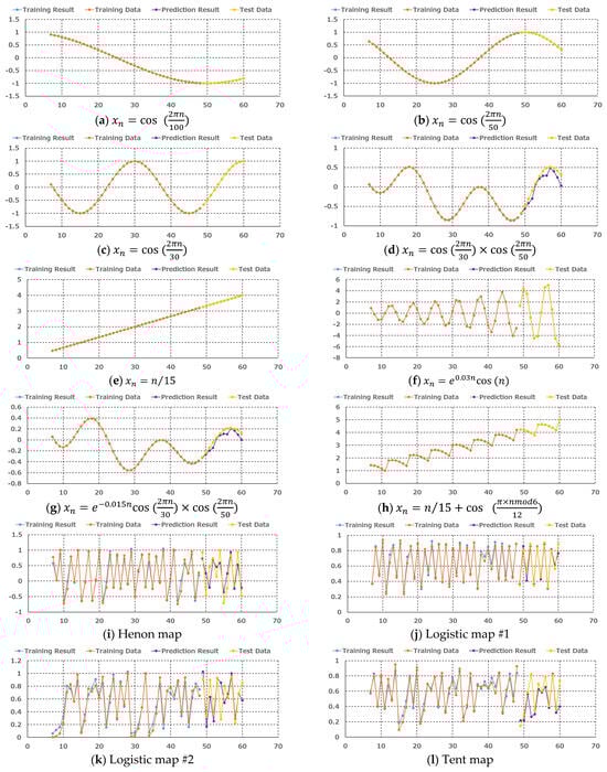 The results of the forecasting trials are presented in Figure 6. In the figure, the time series data of the test functions are divided into the first set of training data used in trial 1 (see Figure 5) and the second set of all test data, along with the corresponding training results and forecasting results. As shown in Figure 6a–h, the training and forecasting results for data with periodicity and trend variations are almost perfectly coincident with the training and forecasting data, indicating very good training and forecasting accuracy. In particular, the forecasting for time series representing trend variations demonstrates high accuracy even outside the range of the training data. This reflects the validity of the dynamical representation for the transition of the regular time series data, and as a result, high accuracy for extrapolated forecasting becomes possible. On the other hand, as shown in Figure 6i–l, while the training and forecasting results for irregular time series data generally reproduce the training and test data, there is a tendency for training and forecasting errors to be larger compared to the results for the regular time series data. One factor contributing to this may be the sensitivity to initial conditions in chaotic systems [25] and the influence of random noise. Therefore, in forecasting time series data that mix regular and irregular variations, better forecasting accuracy can be achieved by separating these two types of variations from the original data.