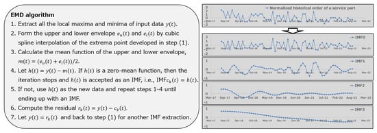EMD algorithm and an example of IMF modes for the historical order data of a service part.