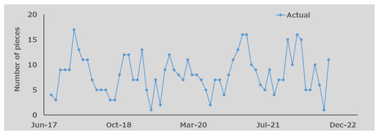 where and represent the forecasting value and the actual value for the validation month , respectively. As shown above, the error represents the difference, normalized by the average of the actual data over a year from month to month , between the actual order results and the forecasted values. Therefore, it becomes possible to compare forecasting accuracy using the error and score values, even among parts with significantly different demand scales. Furthermore, the use of the score values can avoid the drawback of MAE and MAPE being unable to adequately assess errors with small values. By weighting the denominator in Equation (18), it allows for a balanced evaluation of errors even when the scale of the predicted values varies significantly.