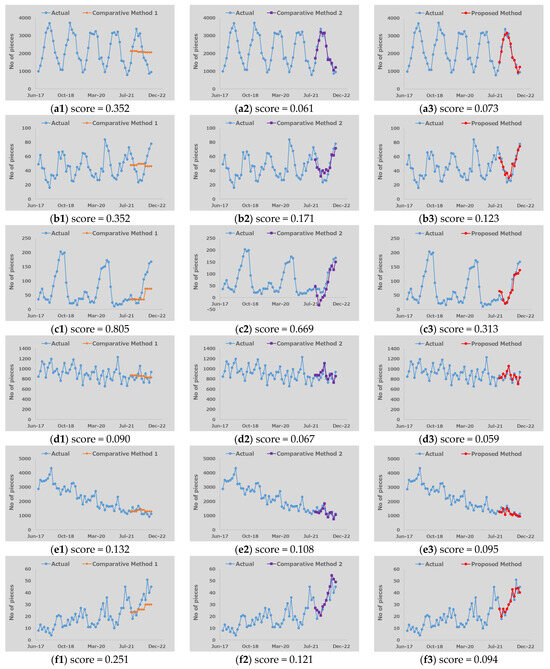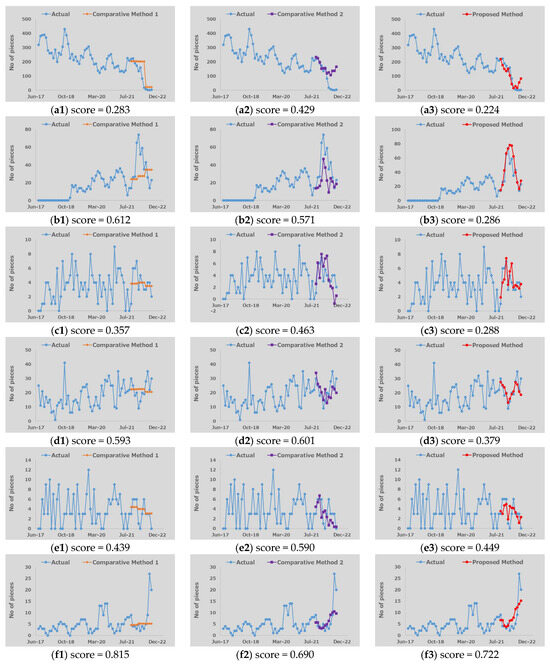 The actual historical orders, forecast waveforms, and the corresponding score values for some representative parts with multiple demand patterns are shown in Figure 11 and Figure 12. In each figure, the results in a row show the forecast results for an individual service part while the left column, the middle column, and the right column show the forecast results using Comparative Method 1, Comparative Method 2, and the proposed method, respectively. First, the results for demand patterns with strong seasonality (annual periodicity) are presented in Figure 11a. The forecast waveforms of Comparative Method 2 and the proposed method demonstrate good accuracy in reproducing annual periodic fluctuations compared to Comparative Method 1, with Comparative Method 2 showing the best results due to its assumption of annual demand patterns in the historical order data of service parts. Conversely, for the demand patterns representing weak annual periodicity (where order quantities fluctuate within a trend of annual periodicity) shown in Figure 11b and the two-year periodic demand pattern shown in Figure 11c, the forecast accuracy of the proposed method exceeds that of Comparative Method 2, suggesting the capabilities of DMD and EEMD for forecasting demand patterns with different periodicities.