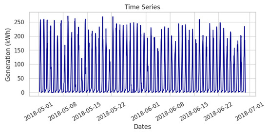 The PV power generation data (in kWh) is provided for the period from 1 May 2018 to 30 June 2018, with hourly intervals from 6:00 a.m. to 6:00 p.m. This timeframe reflects the significant generation patterns observed in Colombia, where sunrise typically occurs around 6:00 a.m. and sunset typically occurs around 6:00 p.m., with minor variations throughout the year, resulting in 13 daily data points (see Figure 2).