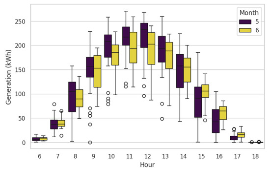 Upon analysis of the time series boxplot, it was also observed that the month and hour of generation information exerted a significant influence on the series’ behavior (see Figure 4).