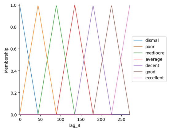The training of the fuzzy model requires the creation of terms that can be used for the automatic extraction of rules. In this instance, given that the data set is a time series, the terms will be the values that precede the value to be predicted. This quantity is referred to as the size of the window or lag. Furthermore, the number of fuzzy sets that will be utilized to contain the universe of the time series is defined (for example, as shown in Figure 5 that has 7 fuzzy sets).