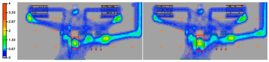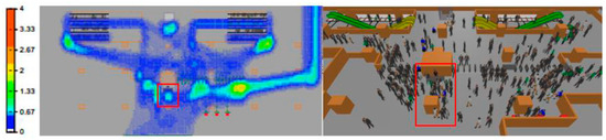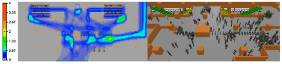 Figure 3 shows the heatmap after setting up a SC at its usual location. The red rectangle highlights the crowd in the SC queuing areas, which is still manageable under 1.33 pax/m2. The crowd density at the right gantry set is increased and widened towards the middle gantry set due to the increased passengers with paths to the SC location.