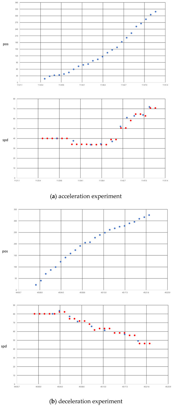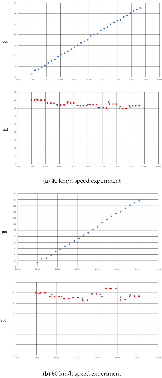 Driving experiments were conducted using the BLE CLOBER testbed installed in the Gise Tunnel. The driving experiments included constant speed tests and acceleration/deceleration tests. The constant speed tests were performed in Cruise drive mode at speeds of 40, 60, and 80 km/h to maintain a constant speed. Figure 5 shows the position and speed profiles for the constant speed experiments. In the figure for speed profile, the blue dots denote the speed computed from the slope of DRSS, and red dots are obtained from pass time between two CLOBERS. As shown in the figure, the speed estimation performance was excellent with an error within 5 km/h, and since it was a constant speed operation, the position increased linearly.