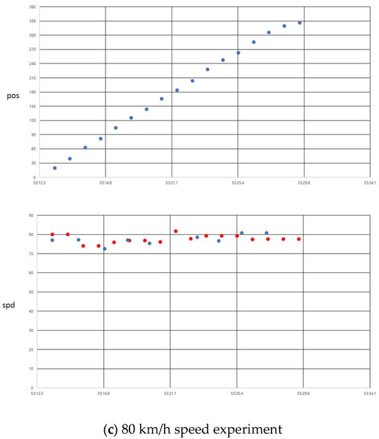 Position and speed profiles for constant speed experiments: (a) 40 km/h speed; (b) 60 km/h speed; and (c) 80 km/h speed.