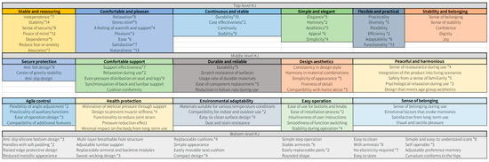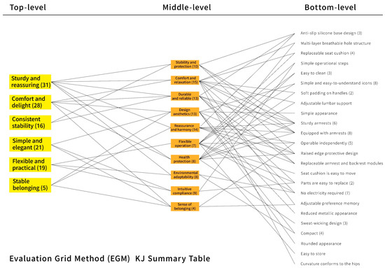 To systematically organize the participants’ feedback and identify common evaluation criteria, we applied the KJ method to visualize the structural evaluation result of assistive seat cushions. This approach aimed to better understand the popularity and specific characteristics of assistive seat cushions among different users. The process involved compiling vocabulary from the in-depth interviews of 10 participants, performing frequency accumulation, and categorizing the upper level (abstract concepts) and middle level (specific conditions). A screening process was conducted with the assistance of one expert with 10 years of industrial design experience and three graduate students from an industrial design program. The results of the KJ method are illustrated in Figure 4.