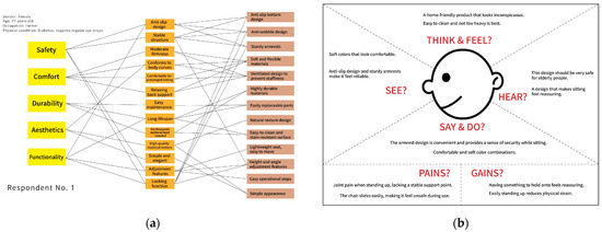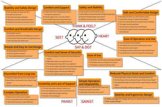 Through feedback from the participants, we summarized the needs and expectations of elderly users regarding assistive chair design in daily life (Figure 7). In-depth interviews and an empathy map analysis of the 10 participants revealed diverse requirements influenced by varying physical conditions, occupational backgrounds, and personal habits. The participants were coded A to J for clarity.