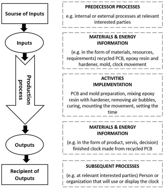 At the beginning of the project, the students were previously presented with a general diagram of the production process, which is based on the concept of the product life cycle [,,,,]. This cycle does not begin with production but with obtaining raw materials and materials. It continues with their transportation, processing in production, and packaging, and transportation and distribution of the final product. In most cases, the life cycle ends with the disposal of the product at the end of its service life while the process of manufacturing the clock begins with the sorting of electronic waste to obtain PCBs and wash them (Figure 2).