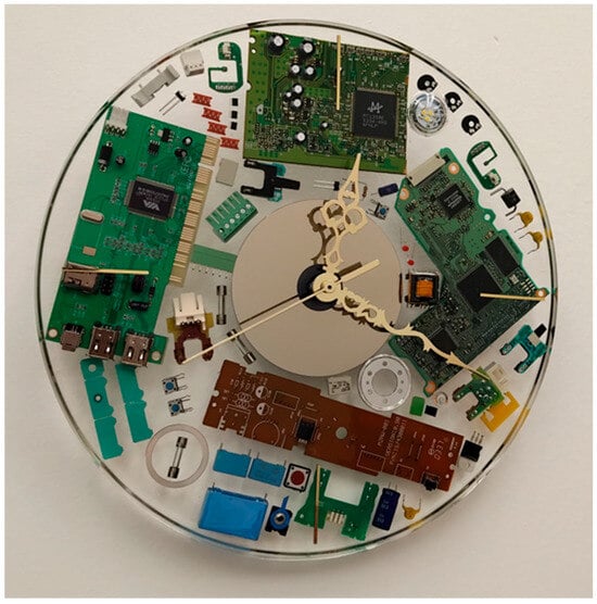 For the experiment, necessary materials were prepared, such as recycled PCBs, epoxy resin with hardener, a round silicone mold, and a purchased clock movement (Figure 1). The PCBs were thoroughly cleaned and possibly cut into smaller pieces to fit the casting mold (a diameter of 28 cm and a height of 5 cm). The round silicone casting mold was cleaned and dried, and then the PCBs were arranged in the mold according to the design. The epoxy resin (CB RESIN ECO, Component A) was mixed with the hardener (CB RESIN ECO, Component B) according to the manufacturer’s instructions and mixed thoroughly. The resin was slowly poured into the mold so that it evenly covered all the PCBs until no air bubbles formed. A heat gun was used to remove the bubbles. The resin was allowed to cure according to the manufacturer’s instructions, which took several hours to days (curing time according to the manufacturer’s instructions was from 12 to 48 h). The clock was removed from the mold. The surface was sanded with sandpaper to make it smooth. A hole in the center of the clock was drilled for the clock movement, which was mounted according to the manufacturer’s instructions. Finally, the hands were added and the time was set. The last step was to introduce and present the unique clock made from recycled PCBs to students and teachers.